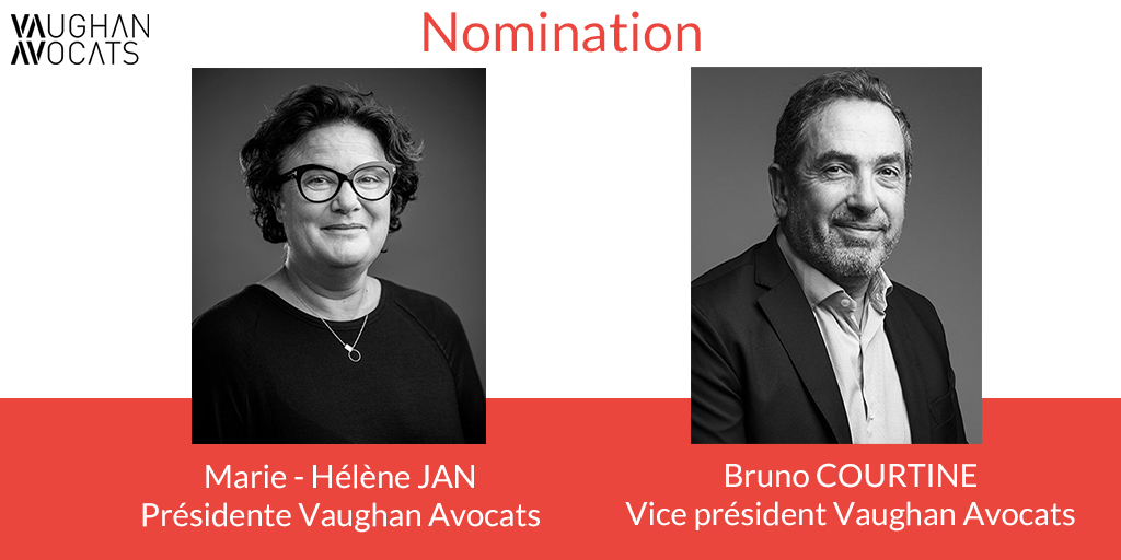 Publié le : 18/05/2020 18 mai mai 05 2020We are vaughanVaughan Avocats annonce la nomination de Marie-Hélène Jan en qualité de Présidente de l’AARPI VAUGHAN Avocats. Elle sera secondée pour cette mission par Bruno Courtine, associé fondateur du Cabinet, qui est ainsi désigné Vice-Président. Cette élection a été réalisée par l’assemblée des associé...
